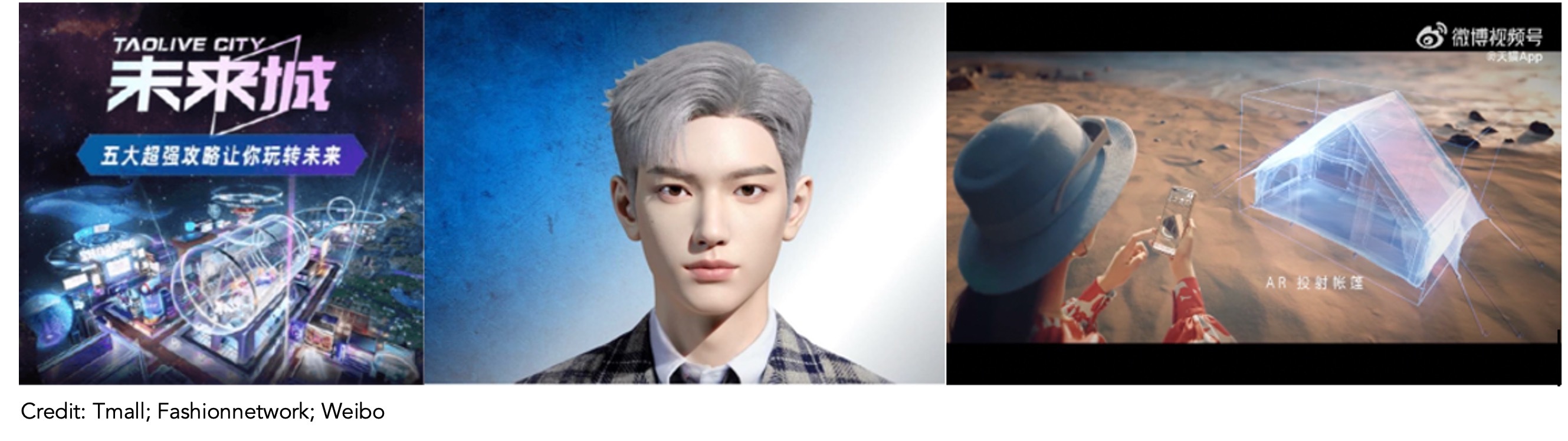 Tmall led the way in using virtual reality to enhance the shopping experience. Ali Cloud and XR Lab launched the first immersive VR neighborhood on Taobao, letting shoppers adopt virtual characters, enter virtual stores and browse products in the neighborhood. On the Tmall app, shoppers could become virtual characters and travel to different brand pavilions and experience 3D shopping. The immersive experience allowed shoppers to execute virtual try-ons, visit virtual exhibitions and watch TV dramas while shopping, all without VR/AR headsets or goggles. Taobao created “Future City” to let people experience the virtual world and discover the future of shopping. The virtual city also held the first-ever all-star virtual idol singing variety show. Tmall Luxury debuted its first virtual influencer curator, TIMO, to guide shoppers through 3D digital collectibles, international brand exhibitions and digital art galleries.